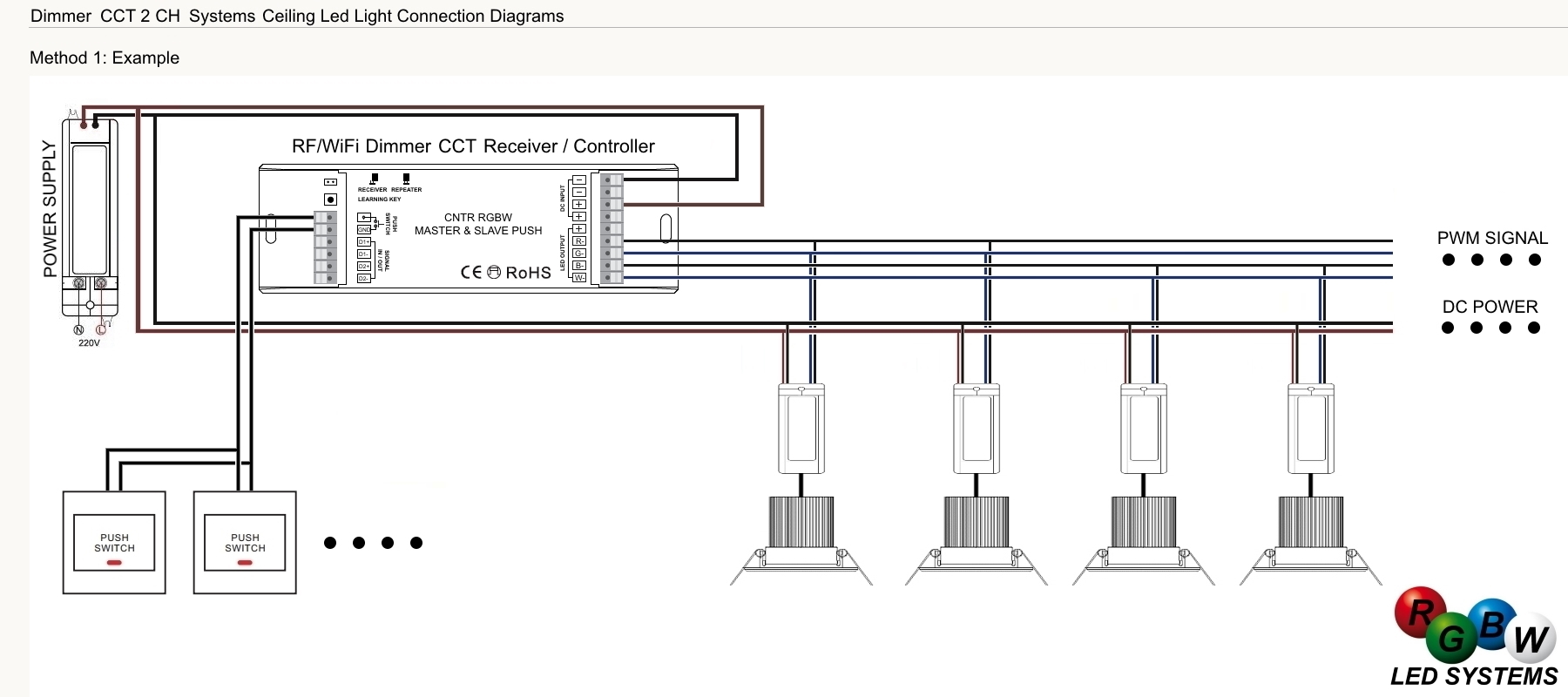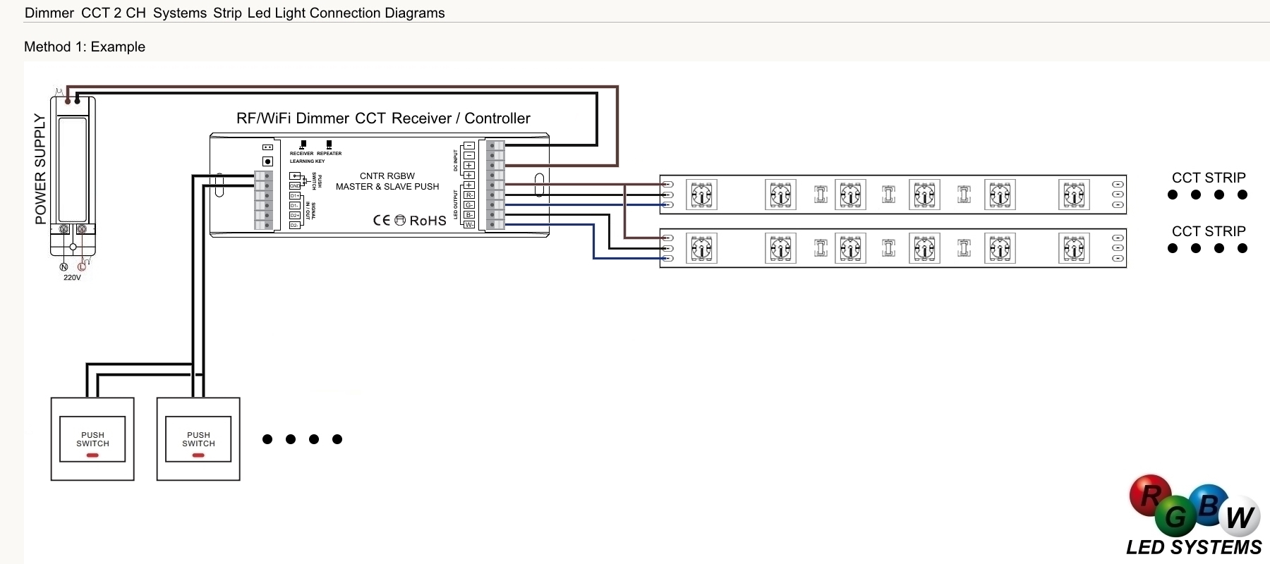 - Conecte R-G-B-W en sistemas CCT (R=CW, G=WW, B=CW, W=WW), los 2 canales CCT funcionan en sincronización.