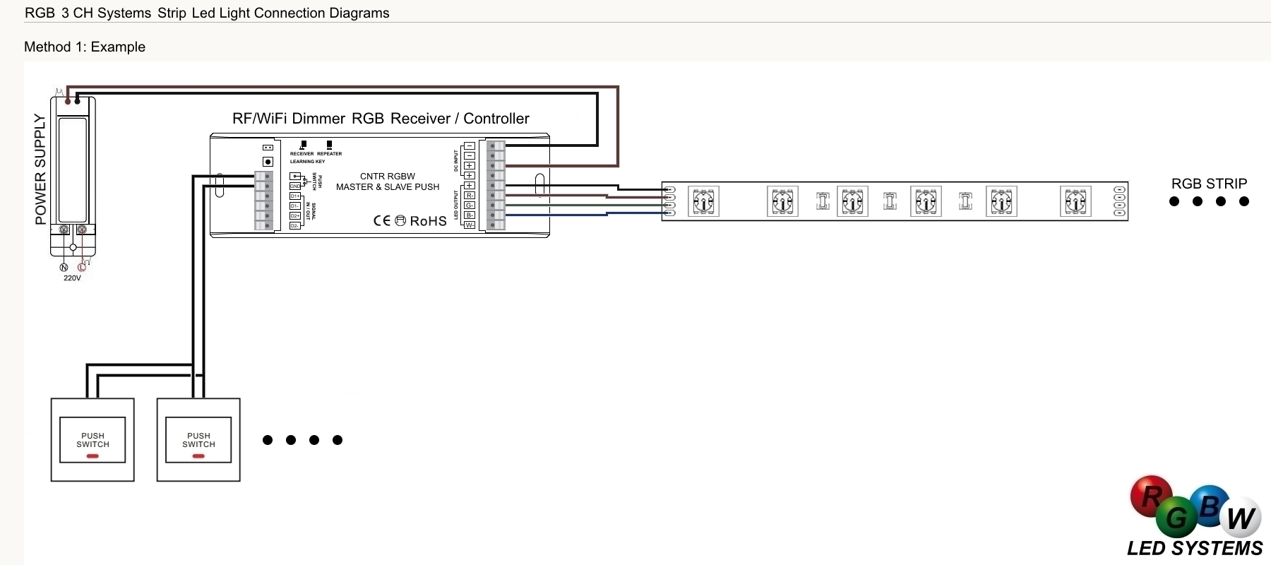 EJEMPLO DE SISTEMA DE CONEXIÓN DE TIRA LED RGB CON CONTROL PULSADOR Y DE RF (SERIE ELEGANCE) A PWM: