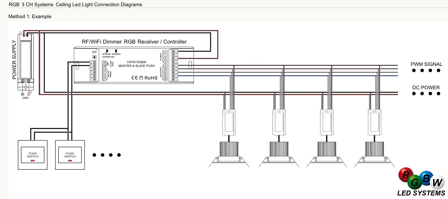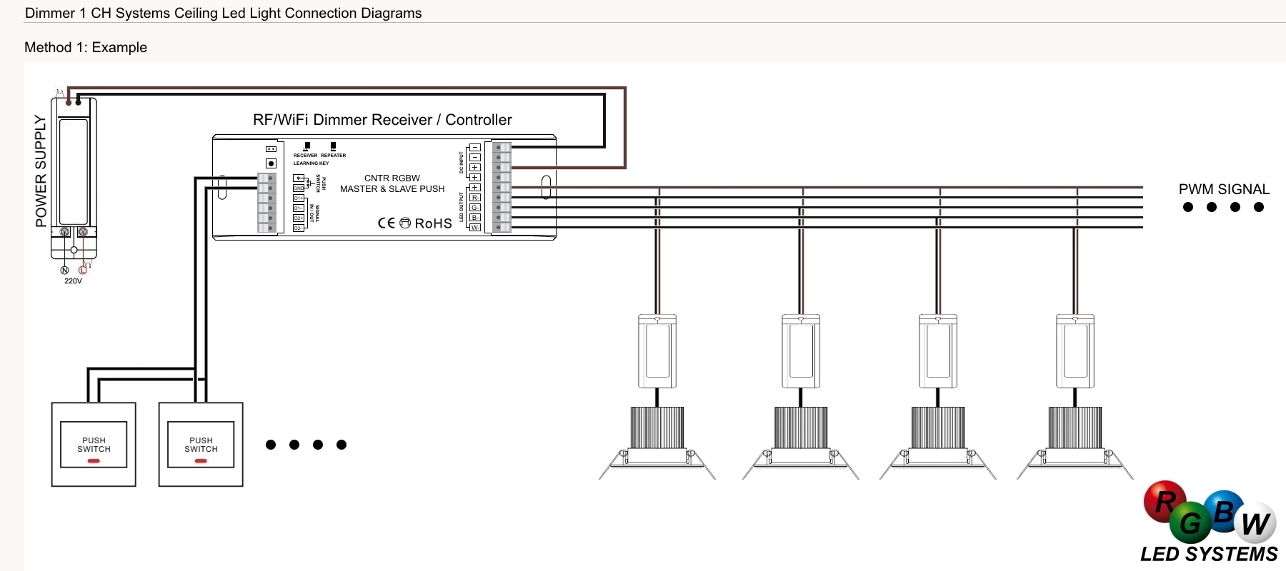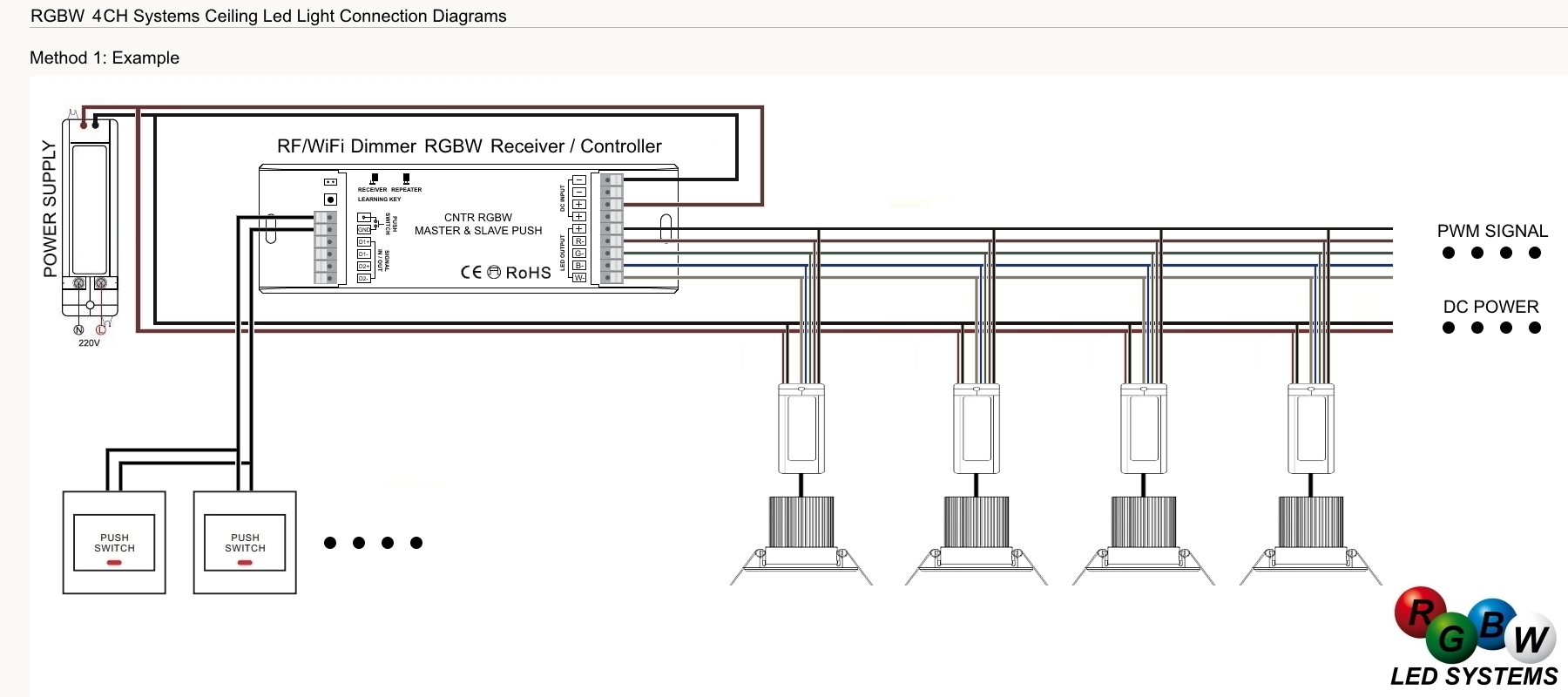 EJEMPLO DE SISTEMA DE CONEXIÓN DE FOCOS EMPOTRABLES RGBW CON MANDO PULSADOR Y DE RF (SERIE ELEGANCE) A PWM:
