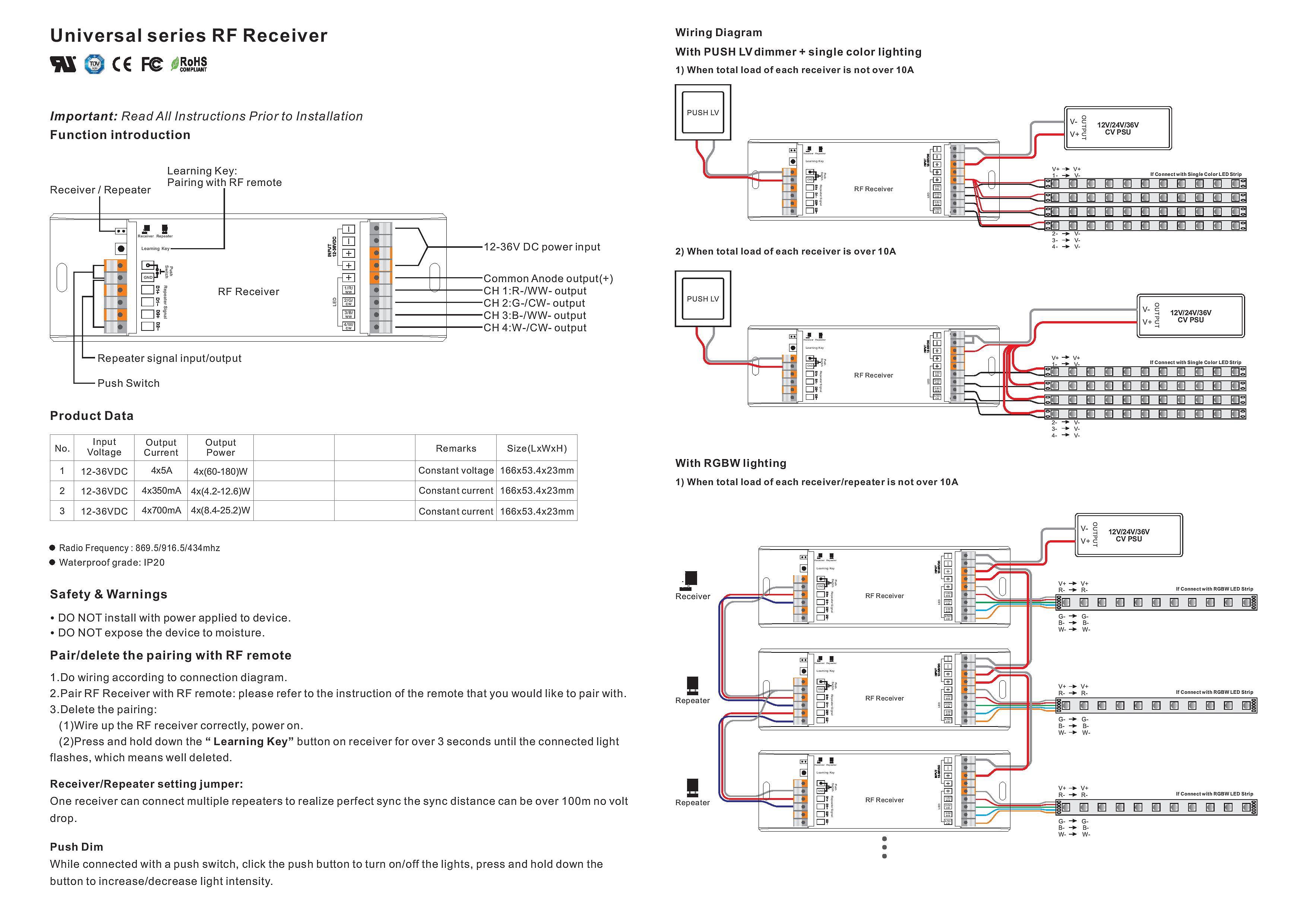 E' possibile comandare strisce a LED, faretti da incasso, segna-passi e proiettori monocrome, CCT o con la tecnologia RGB ed RGBW PWM. Ogni zona può lavorare in sincro o separatamente e vengono gestite da uno o più radiocomandi singola o multi-zona, touch panel a muro e dal modulo wifi con segnale RF in radiofrequenza. Potete comporre a piacimento il vostro sistema modulare perché il segnale tra tutte le elettroniche è RF wireless. La configurazione di associazione tra radiocomandi e/o touch panel a muro del sistema modulare è semplice grazie al pulsante "learning key" direttamente nel ricevitore CNTR-RGBW-Master & Slave Push 350. Il segnale radio è stabile nel tempo e non crea interferenze perché il ricevitore lavora con doppia frequenza digitale a 434-868MHz ben distante dalla frequenza del vostro impianto wifi a 2,4GHz. Grazie al comando RF wireless può essere installato in qualsiasi soluzione anche se non sono state fatte predisposizioni per i cavi del segnale verso il sistema da comandare. Indicato per il comando di piccole e medie aree, come abitazioni, piccoli hotel, centri benessere, uffici, negozi, locali, pub, giardini, veicoli ed imbarcazioni con distanze massime tra le varie elettroniche di 20-30 metri in modalità wireless e 100 metri in modalità cablata, la scelta perfetta in ambienti dove non è possibile l'utilizzo di controller RF per causa di elevate interferenze elettromagnetiche o di schermatura del segnale wireless.