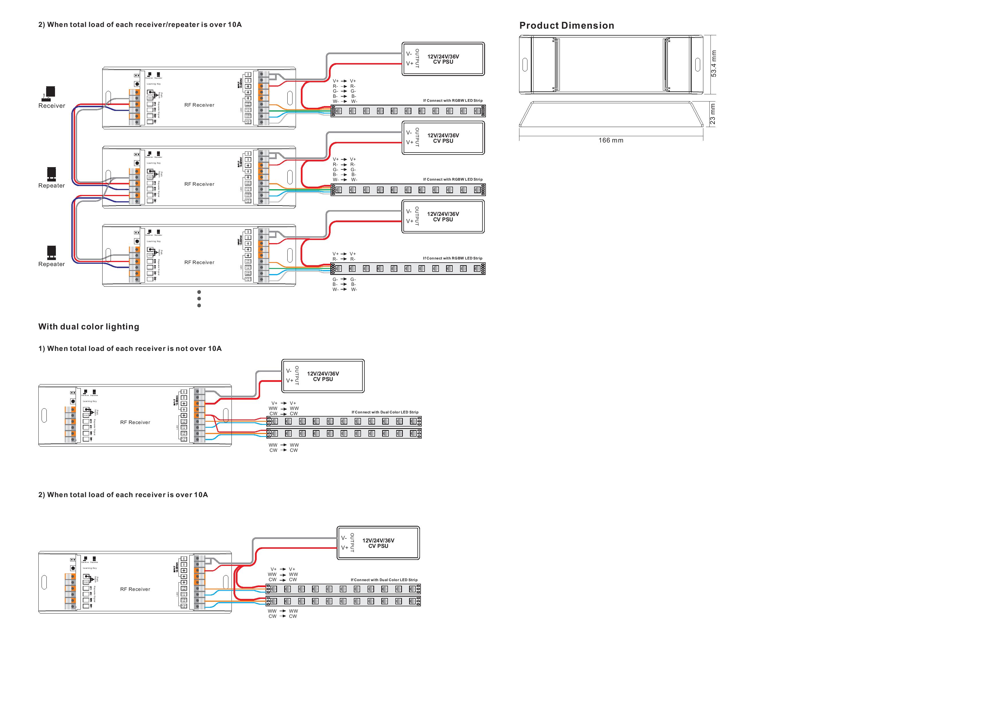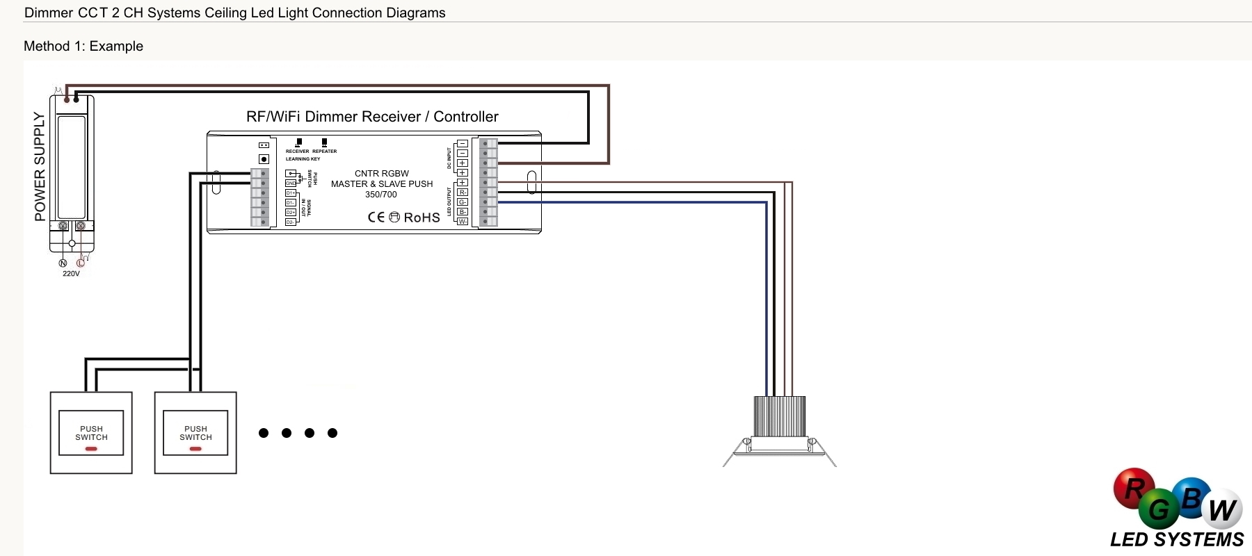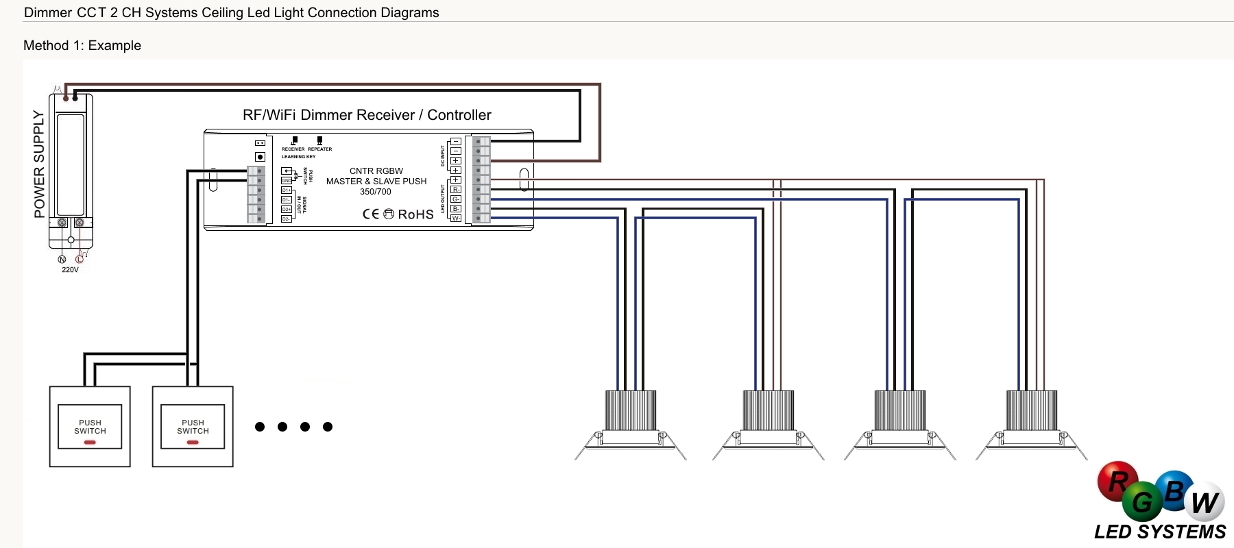 - Collegare R-G-B-W in sistemi CCT (R=CW, G=WW, B=CW, W=WW), i 2 canali CCT lavorano in sincro.