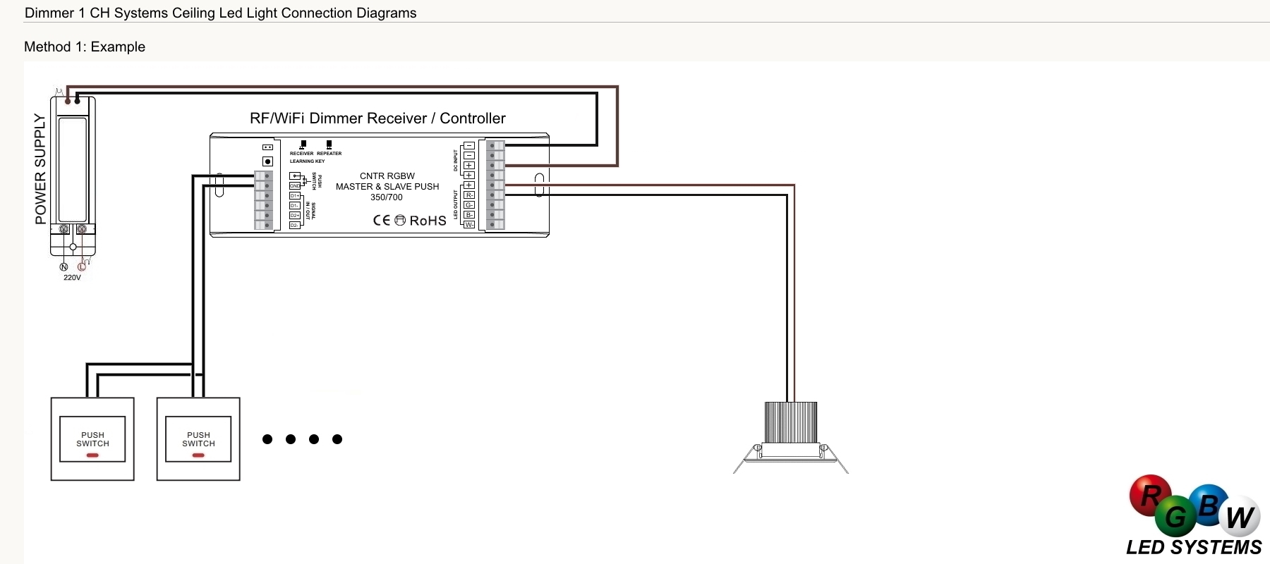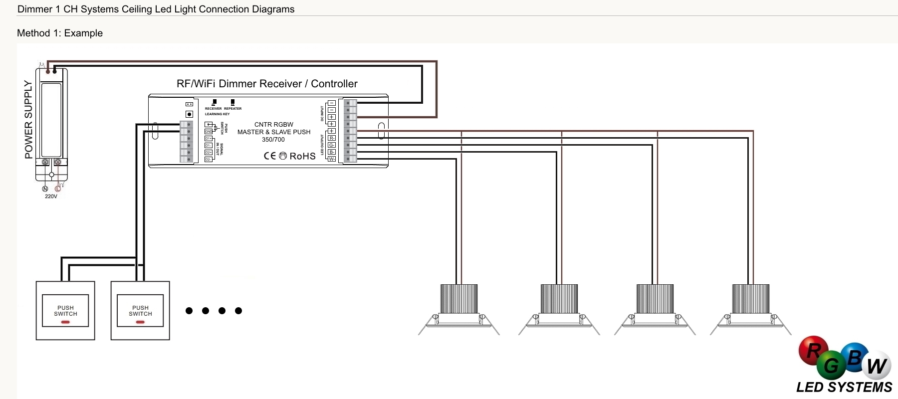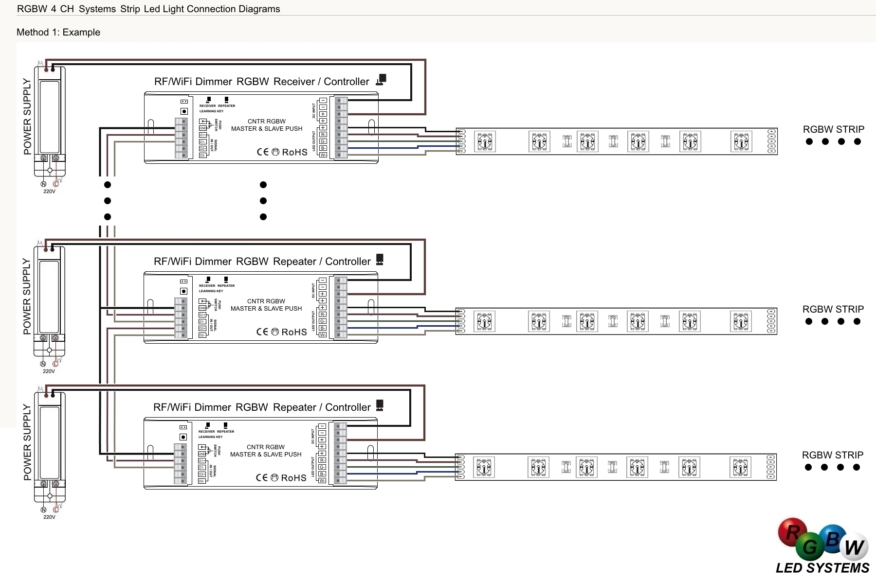 Note: Utilizzare un ricevitore dedicato RF (es: codice CNTR-RGBW-Master & Slave Push 350) per ogni zona da controllare. Possibilità di abbinamenti multipli. I ricevitori possono essere comandati direttamente da touch panel e/o radiocomandi e/o applicazione wifi della stessa zona e in più zone. Azionamento in sincro o separato.